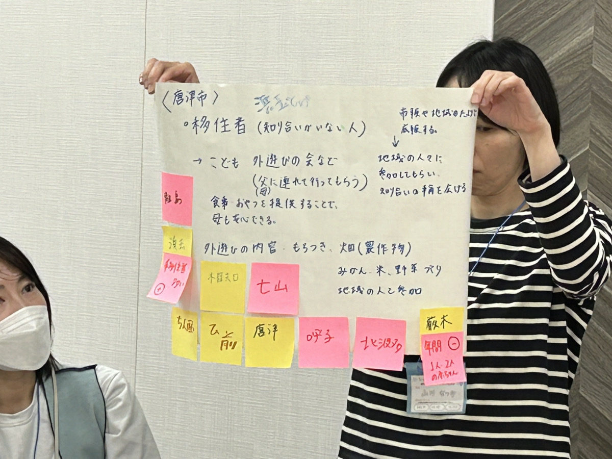 まずは、参加者を3つのチームに分け、チームそれぞれに具体的なイメージをもってディスカッションするために、対象となる地域を決めて、その地域の特性や社会資源、課題感を考え、必要な支援、取り組んでみたい物事について意見を出し合いました。