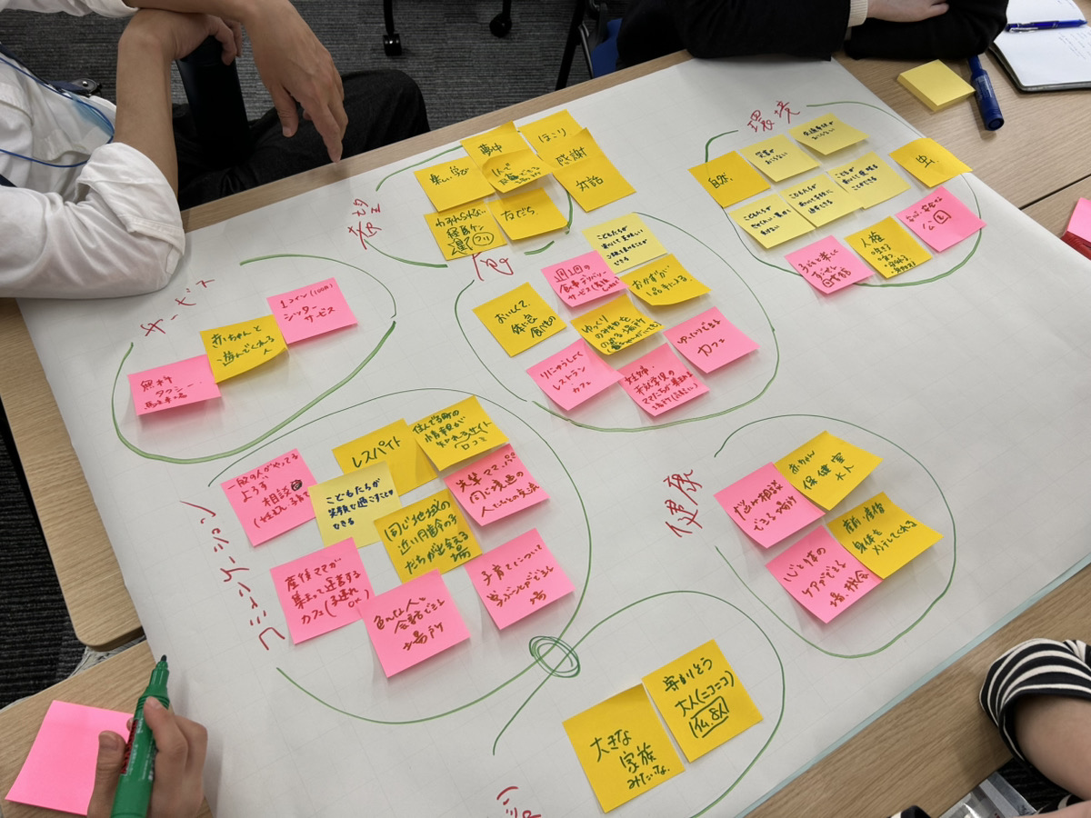 異業種の方が集ったワークショップでしたので、子育て支援の視点のみならず、行政の視点、企業の視点、学校や地域づくり、多世代間交流など幅広くアイデアが飛び交っていました。