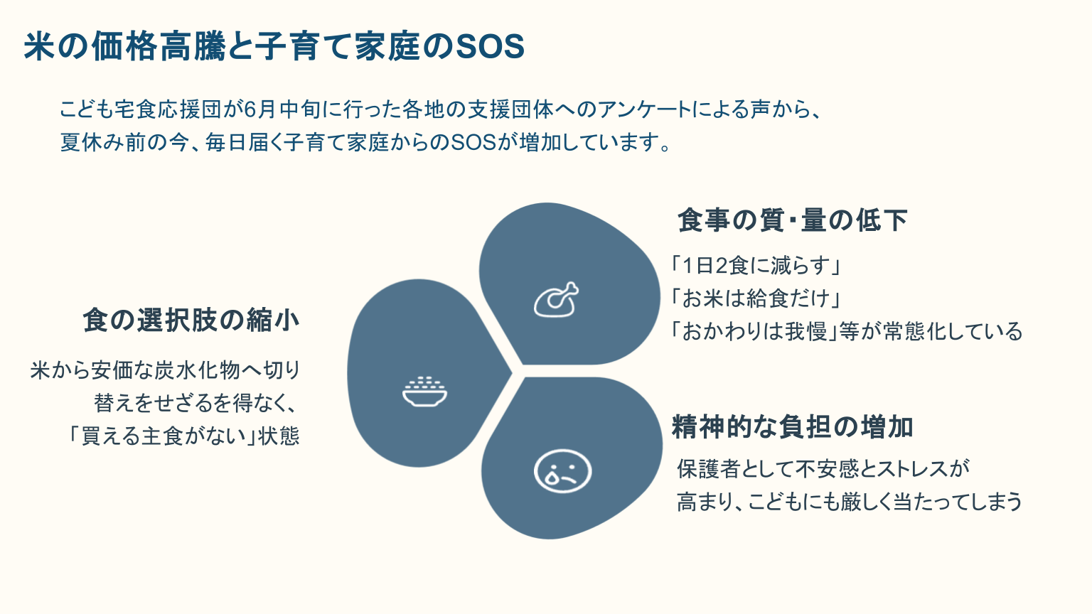 日本では、9人に1人の子どもが相対的貧困状態にあり、生活が苦しくても適切な支援が受けられずに孤立している子育て家庭が存在します。2023年以降の食料品の値上がり、今年の米価格の高騰と米不足を背景に、厳しい状況にある家庭はさらに追い詰められています。