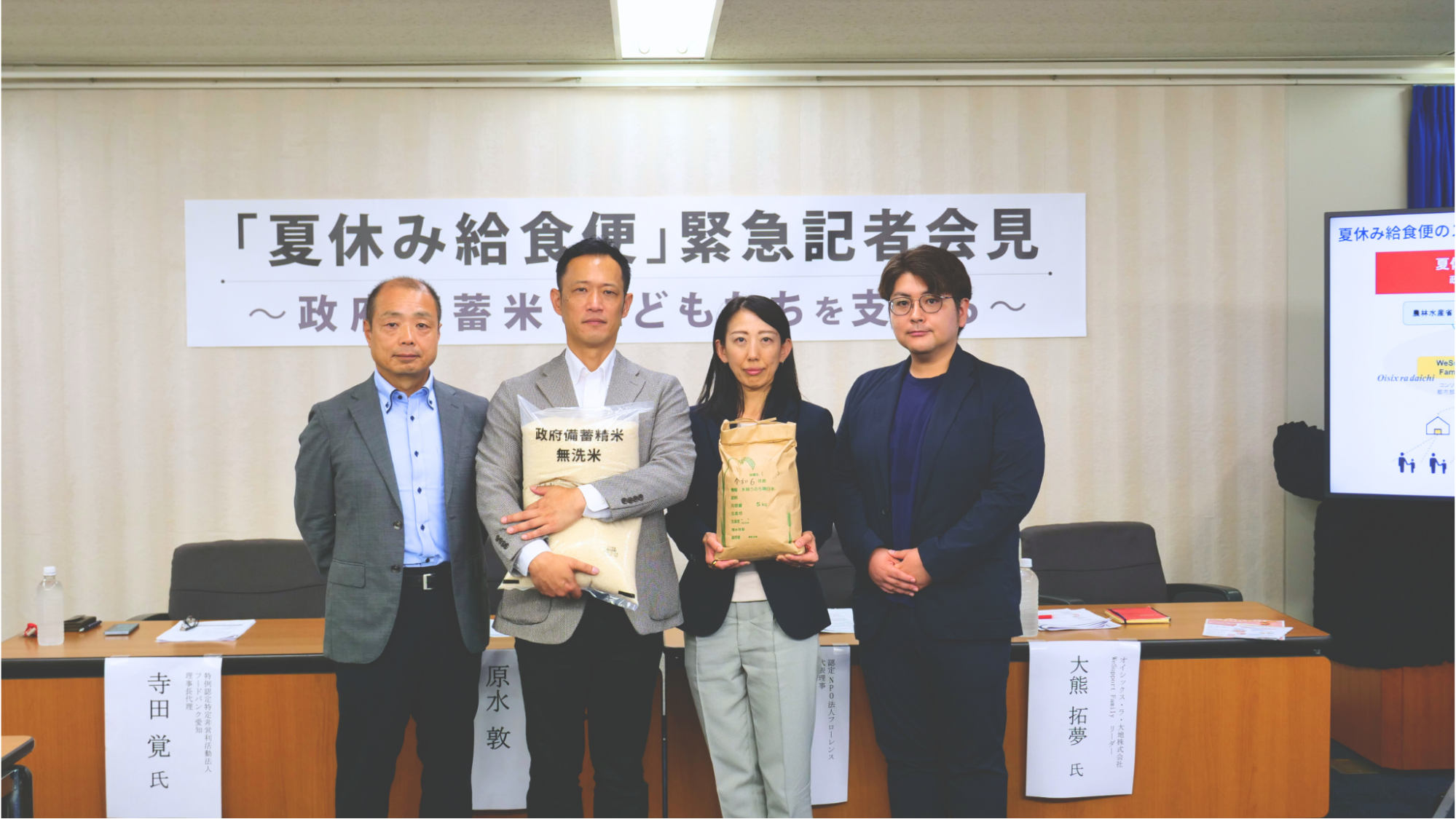 こども宅食応援団と認定NPO法人フローレンスは、特例認定特定非営利活動法人 フードバンク愛知、WeSupport Family運営事務局のオイシックス・ラ・大地株式会社と連携し、「夏休み給食便 ~政府備蓄米でこどもたちを支える~」プロジェクトを始動するにあたり、7/2(水)に記者会見を実施しました。このプロジェクトは、全国の困りごとを抱える子育て家庭 約1.2万世帯に、政府備蓄米合計12トンをはじめとした食品などを届ける緊急支援プロジェクトです。