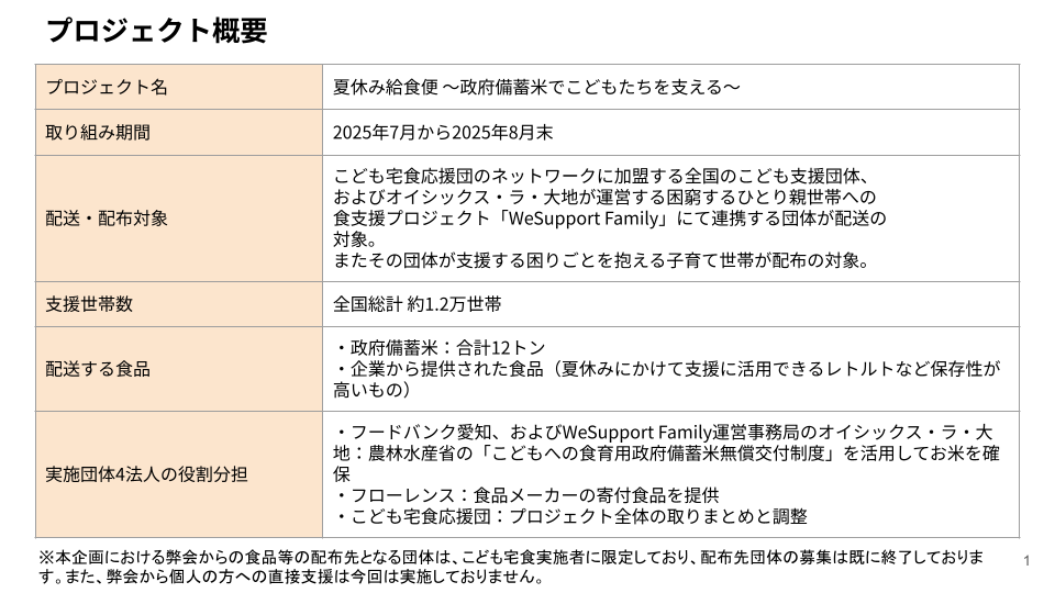 平時から支援食品の融通を相互に行っているフードバンク愛知さんとWeSupport Familyさんにも賛同いただき、4法人共同で、全国の困りごとを抱える子育て家庭に対して緊急で政府備蓄米や食品をお届けする取り組みが、今回行う「夏休み給食便~政府備蓄米でこどもたちを支える~」プロジェクトです。