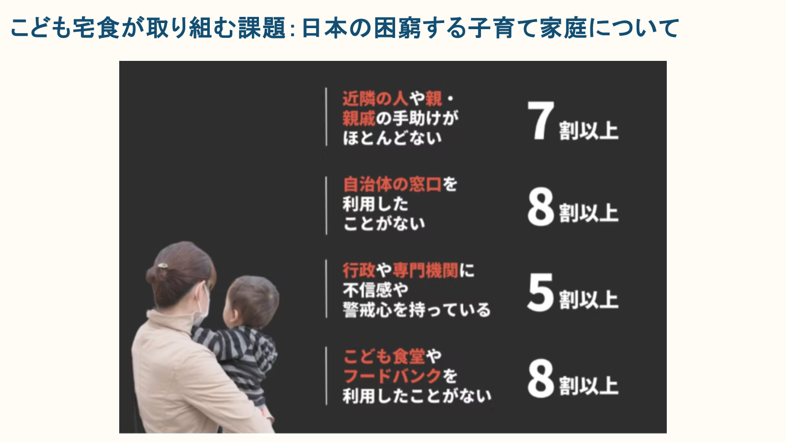 こども宅食応援団の原水は、今の日本では、苦しい状況にある子育て家庭の実態が気づかれにくい状況にあり、「こども宅食」というアウトリーチ型支援が求められている背景をご説明しました。