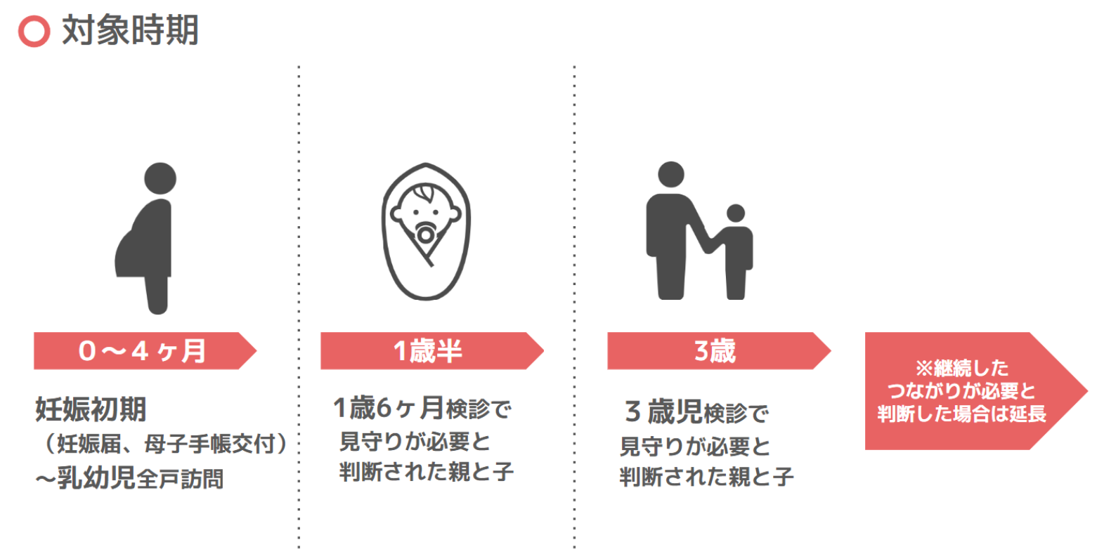 対象は、特定妊婦(※)や暮らしにおいて困りごとを抱える親子。対象時期は、妊娠届を提出する妊娠4ヶ月頃~3歳までです。3歳以降も、必要に応じて継続して見守り支援を行います。