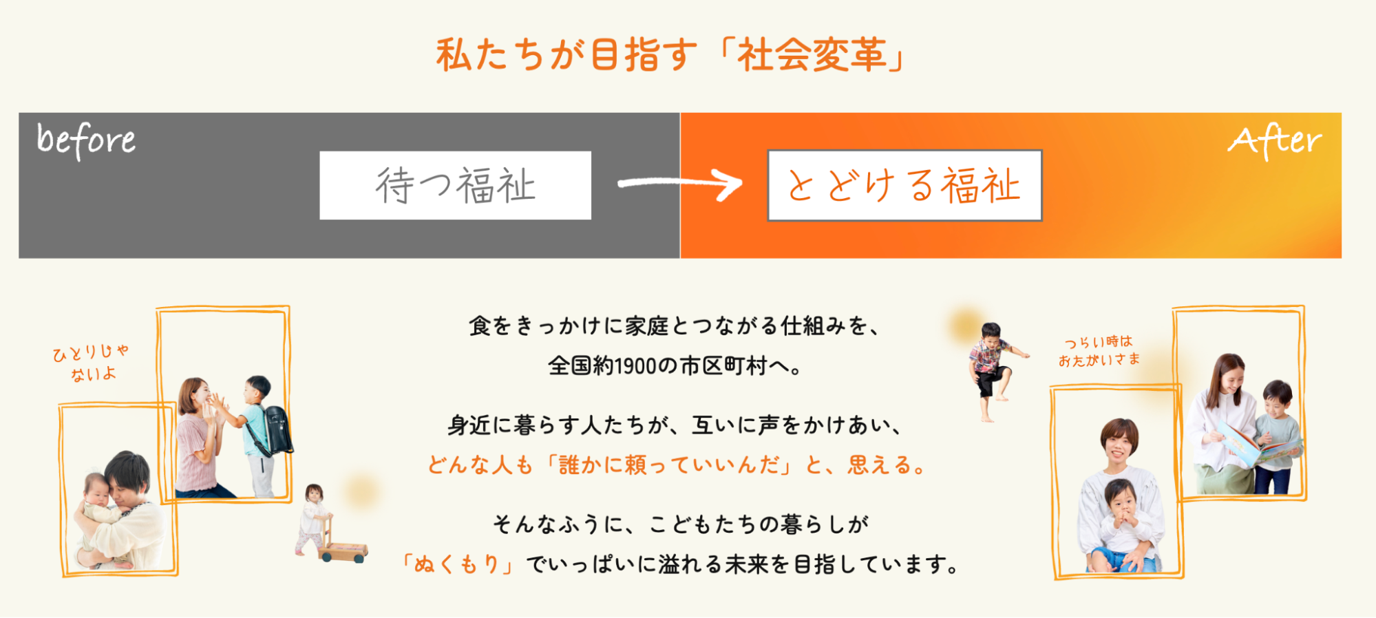 私たちは「今日を生きるこどもたちのために多様な人々が手を携え孤立を生まない社会を創る」ことを目指しています。私たちだけでは、すべてのこどもたちの元へ「ぬくもり」を届けることは難しいけれど、地域や立場を超え、みなさんと手を携えることで、支援の輪を全国の親子のもとへと広げ、子どもたちの「今」を変えていけると信じています。