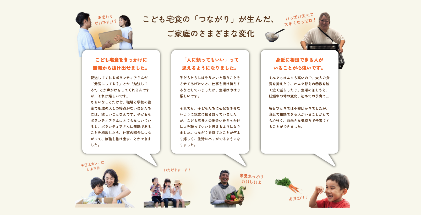 こども宅食が届けているのは、「食」だけではありません。食のお届けをきっかけに、地域で暮らす人たちと親子が、ゆるやかに「つながり」をつくり育みながら、やがて「困った時は、頼ってもいいんだ」と自然と思える。そんな「ぬくもり」を届けるアウトリーチ支援です。