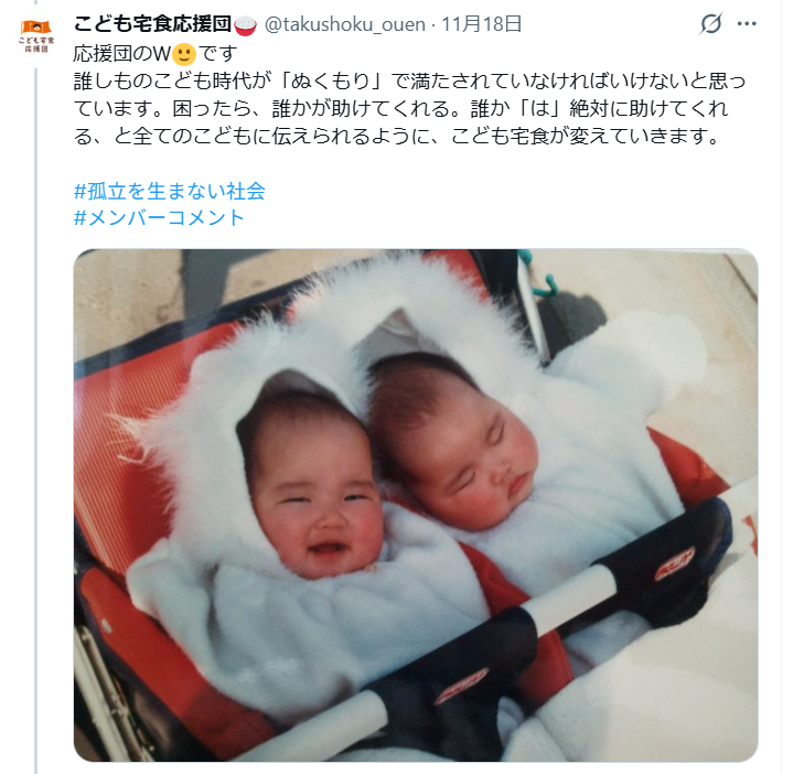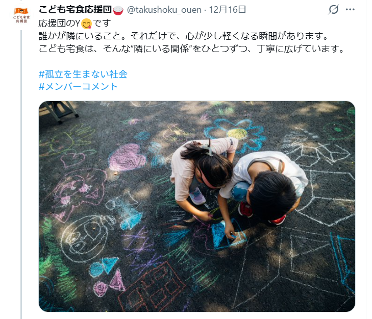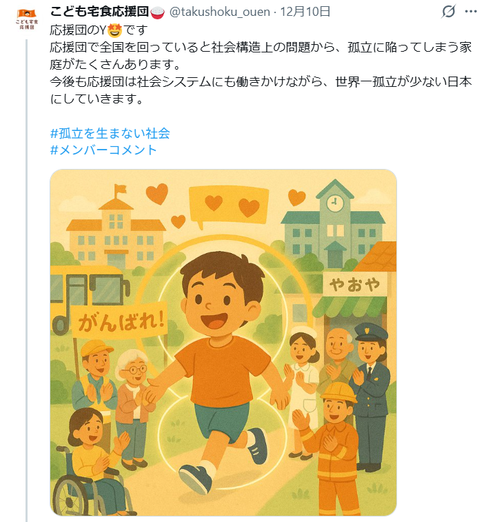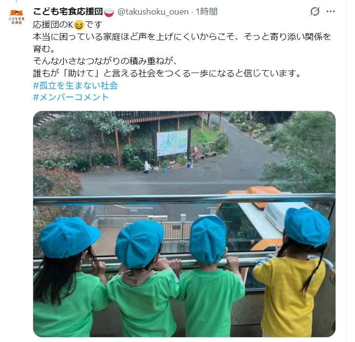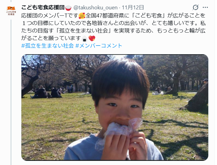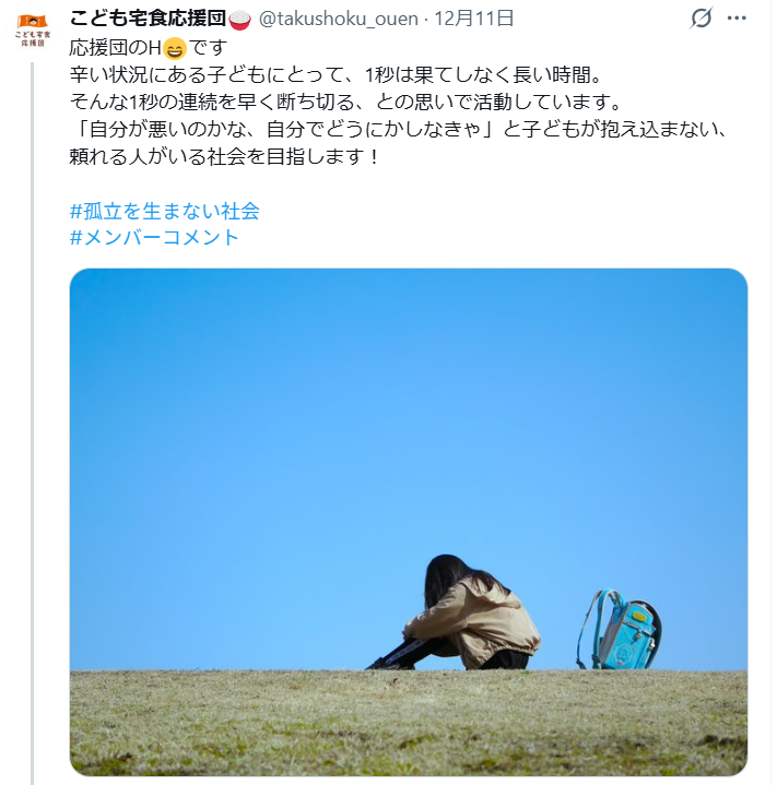 こども宅食応援団のビジョンは「すべてのこどものとなりに、ぬくもりを。」ミッションは「今日を生きるこどもたちのために、多様な人々が手を携え孤立を生まない社会を創る」です。